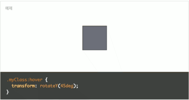 | rotateY(n) | Y축을 중심으로 객체를 회전시킵니다. 아래 종합예제에서 보여줍니다. | ||