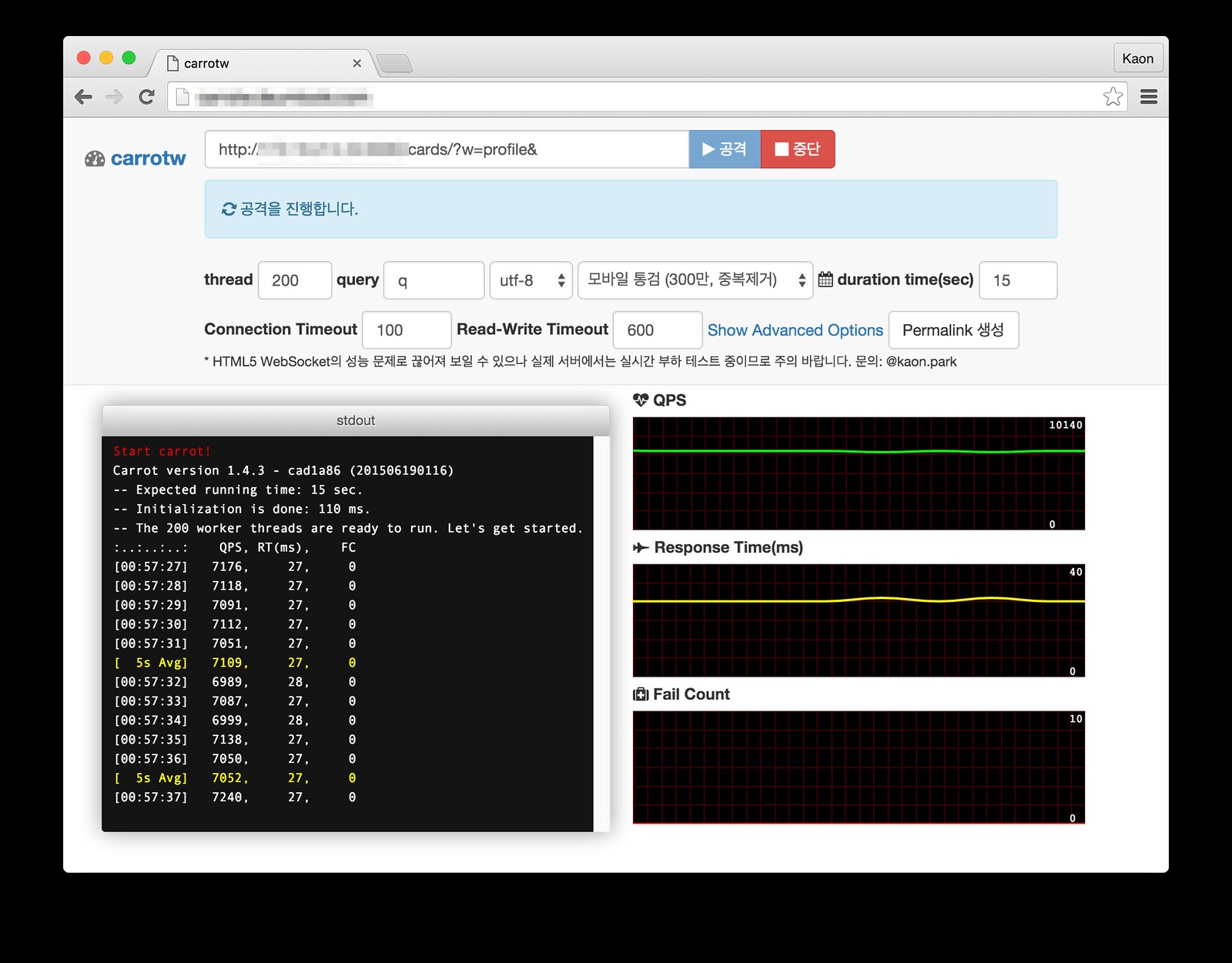 carrotw 는 사내에서 만든 브라우저로 직접 부하 테스트가 가능한 성능 테스트 도구(외부에 공개되지 않은 사내 시스템이라 부득이하게 주소를 가림)다. 전통적인 쓰레드 방식으로 동작하며 여기서는 쓰레드를 200개 주어 최대 성능을 측정했다. 200개 쓰레드가 동시에 요청을 보내 응답을 받아오는 초당 평균 횟수/속도를 측정하는 방식이며 10초간 측정한 결과는 약 7,600 TPS 에, 평균 응답속도 25ms 수준이다.