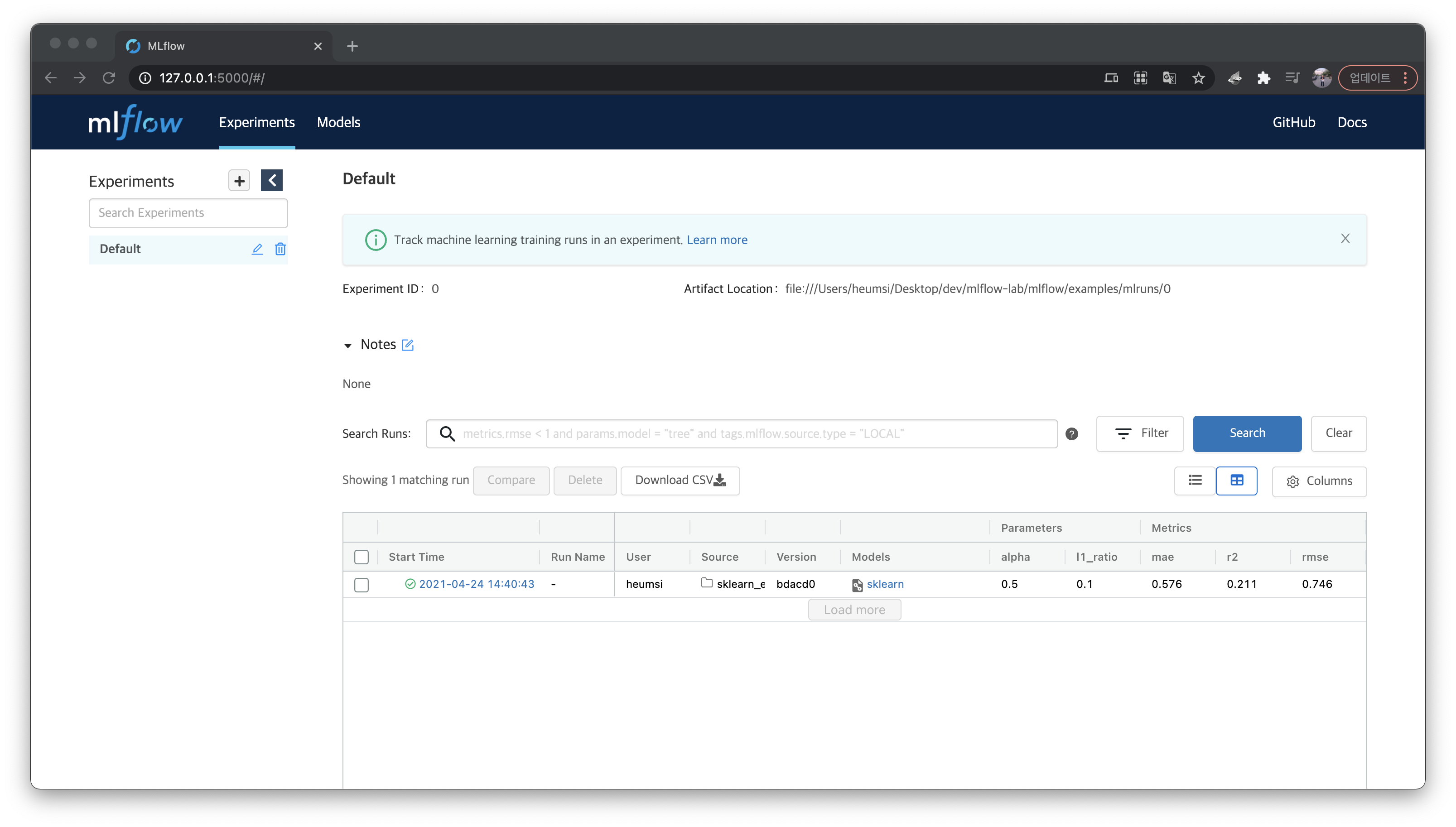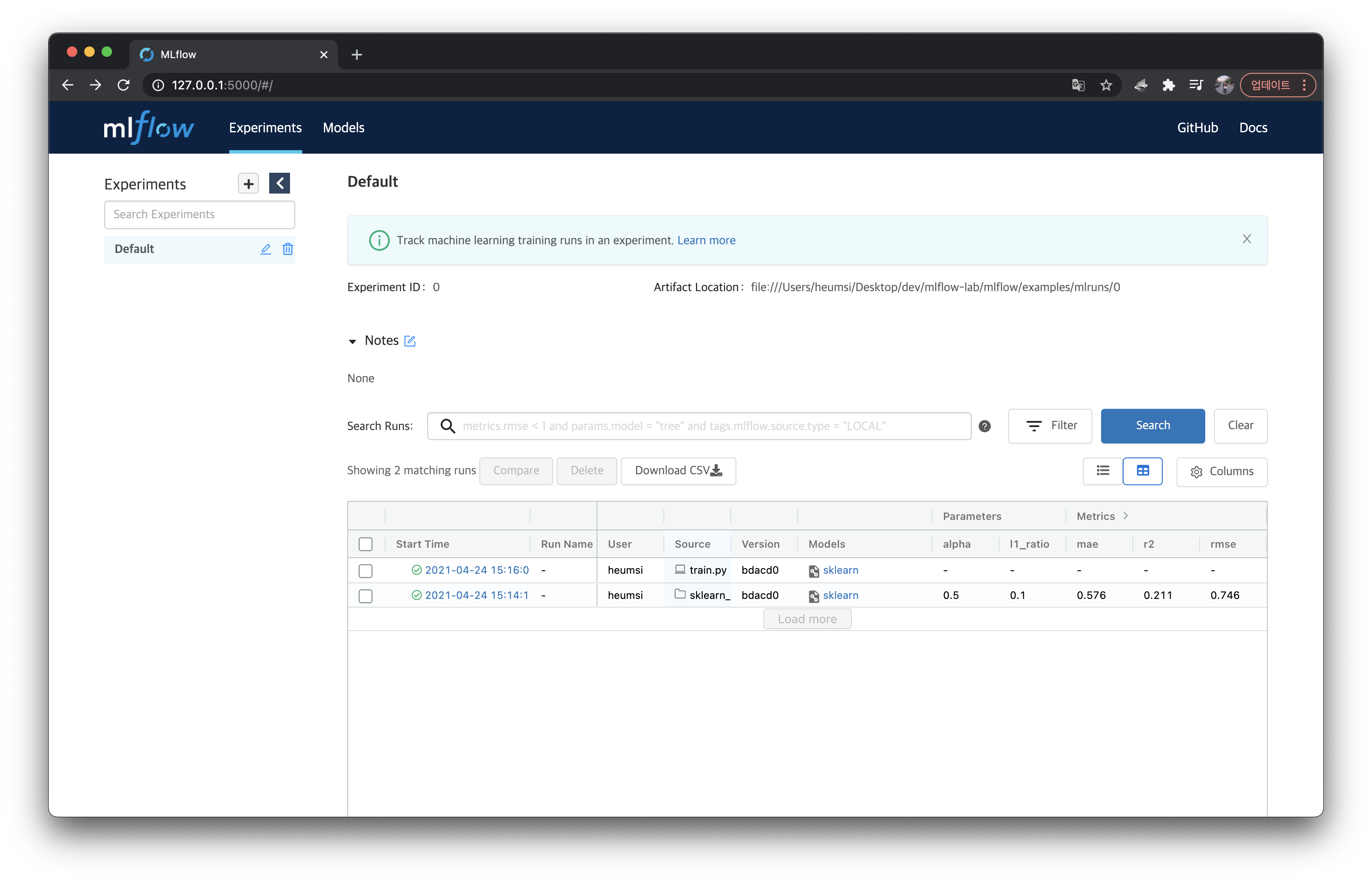 결과물은 역시 ./mlruns 에 추가된다.