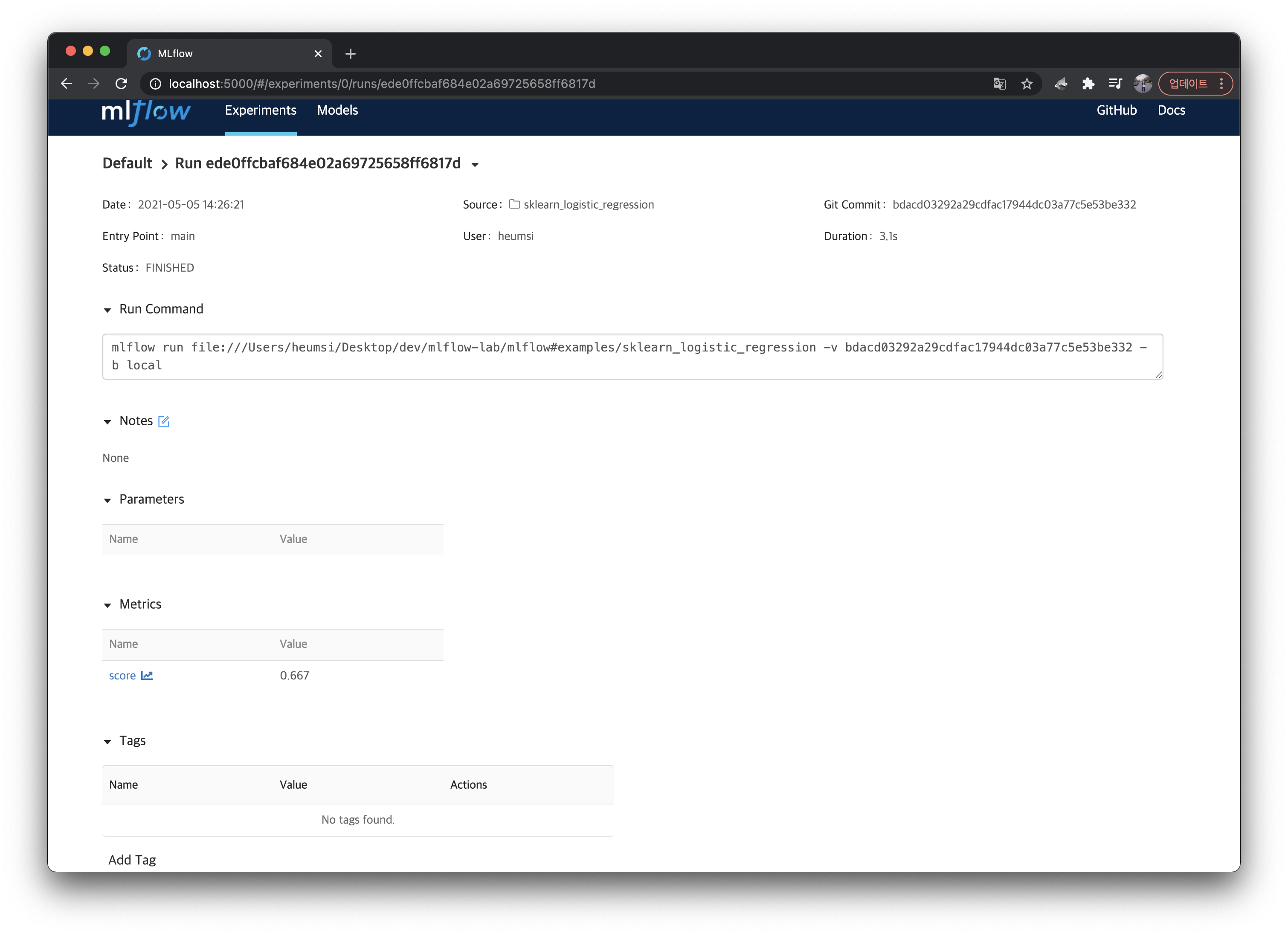 - MLflow 프로젝트에서 실행 된 경우, 실행에 사용 된 Git 커밋 해시