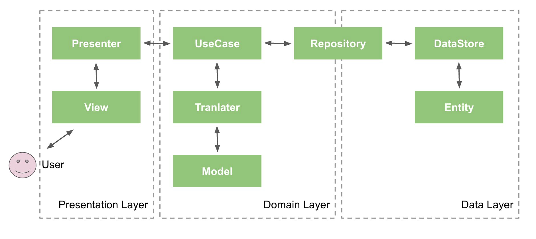 - Repository & Translater : Repository는 유스케이스가 필요로 하는 데이터 저장/수정 등의 기능을 제공하는 클래스입니다. 데이터 소스를 인터페이스 형태로 참조하기 때문에 이 클래스에서 데이터소스 객체를 갈아끼우는 형태가 됩니다. 또한 Tranlator와 함께 구현했습니다. 실제로 구현할 땐 어플의 규모에 따라 하위 요소들을 축소/변형하기도 합니다.