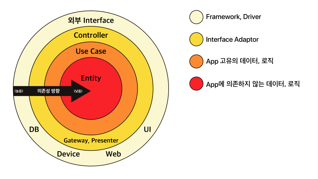 위 그림을 보았듯, 클린 아키텍처는 원 안에 여러 개의 원들이 각각을 감싸고 있는 형태임을 알 수 있습니다. 원의 안쪽으로 갈수록 변경되지 않는 데이터이며 반대로 바깥쪽으로 갈수록 변경될 확률이 높은 요소들이 위치합니다. 원의 가장 안쪽에는 변경될 가능성이 적은 엔티티가 위치하고, 변경될 가능성이 높은 UI/DB 등을 원의 가장 바깥쪽에 위치시킵니다. 이렇게 분리해두면, 변경사항이 생겼을 때 바깥쪽을 중심으로 살펴보면 되니 작업이 수월하겠죠?
