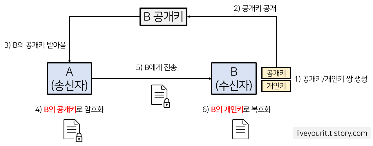 6) B는 암호화된 데이터를 B의 개인키로 복호화 (개인키는 B만 가지고 있기 때문에 B만 볼 수 있음)