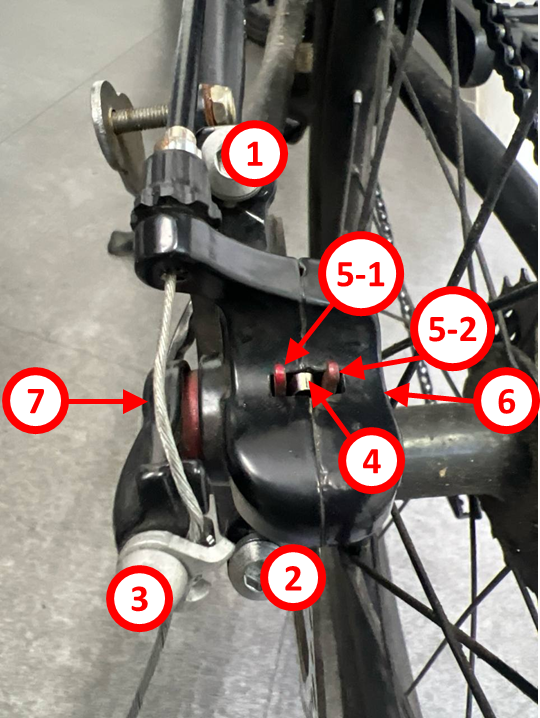 | 브레이크 동작 구조 | 브레이크를 잡으면 7 번 방향으로 힘이 들어가서 5--1 을 조임. 5-2 는 가만히 있기만 하며 5-1 이 조여들어오면 맞닿아서 조여짐. |
