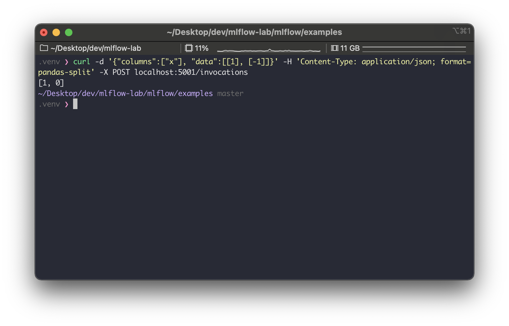 # $ curl -d '{"columns":["x"], "data":[[1], [-1]]}' -H 'Content-Type: application/json; format=pandas-split' -X POST localhost:5001/invocations