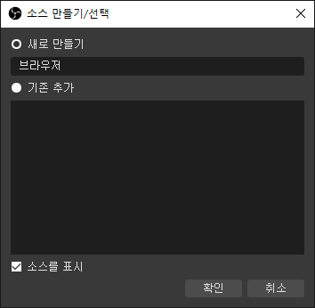 2) 하단 소스 목록에서 + 를 눌러 브라우저 추가