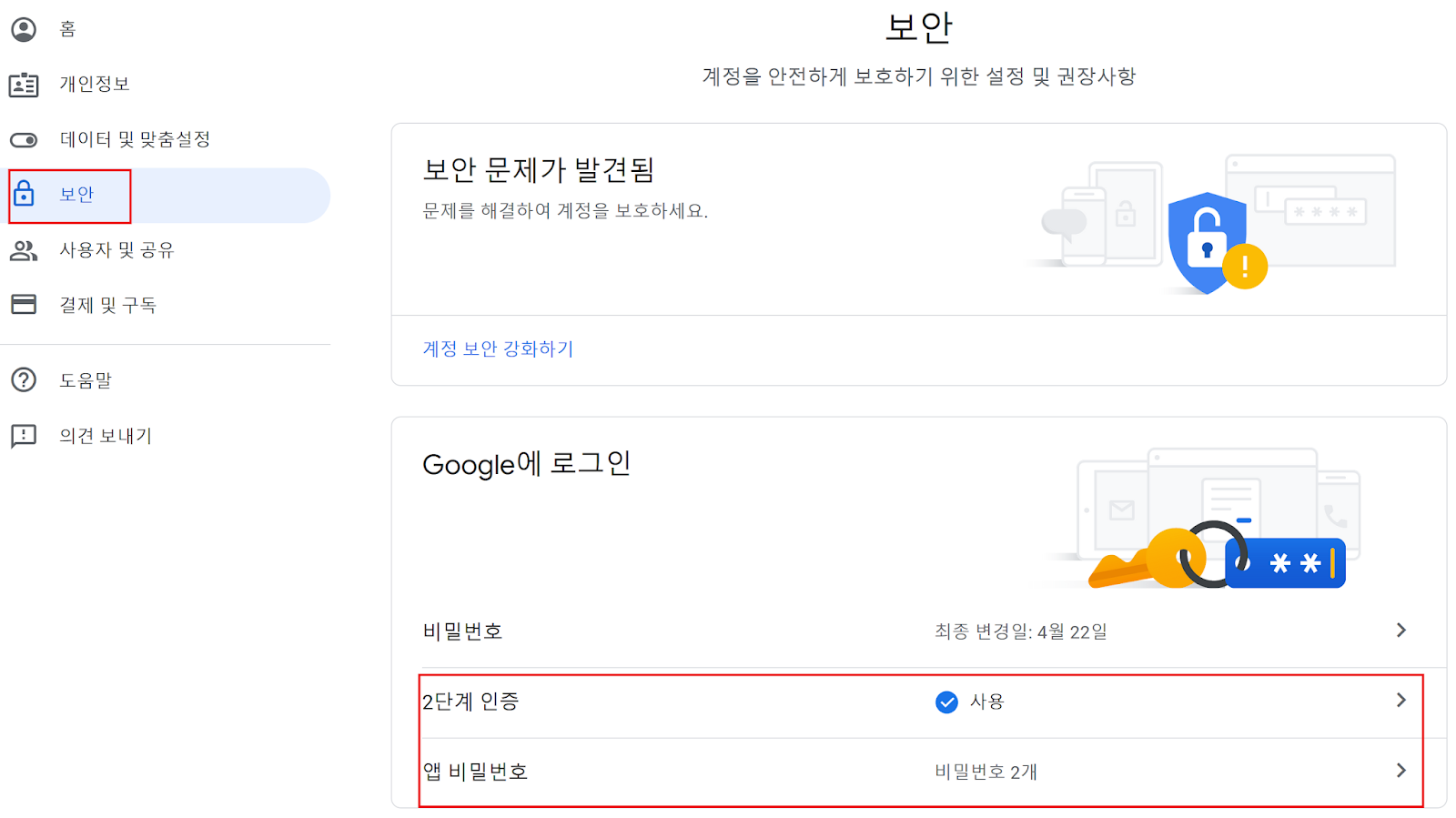 아래에서 "앱 비밀번호" 를 클릭하고 들어가, 비밀번호를 생성하면 된다.