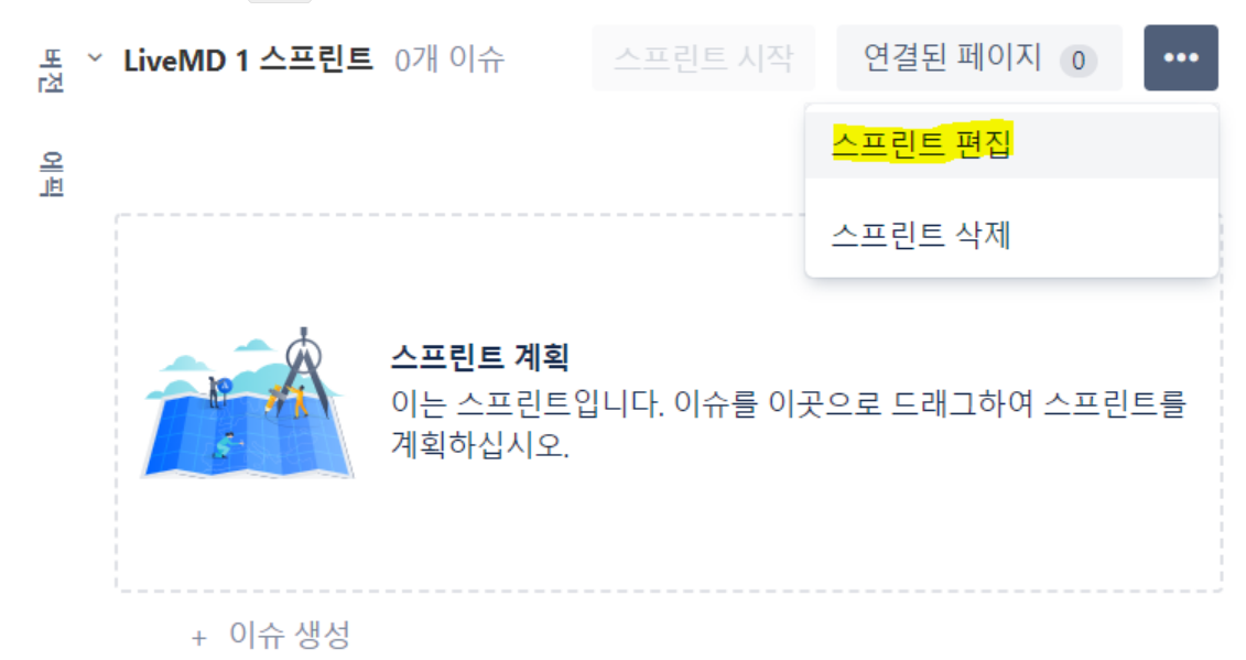 생성된 스프린트의 [ㆍㆍㆍ]버튼을 누르면 편집 또는 삭제가 가능합니다