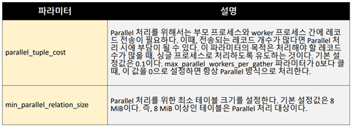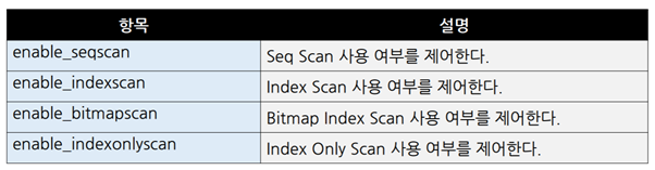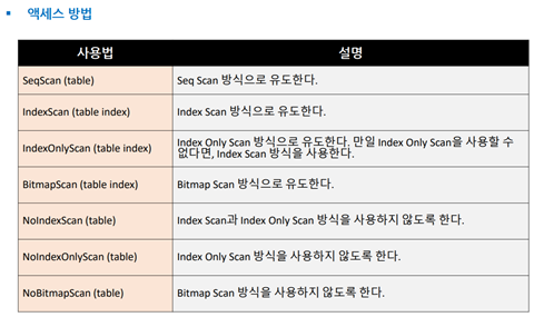 Seq Scan방식 ▪Seq Scan은 테이블을Full Scan하면서 레코드를 읽는 방식이다. ▪인덱스가 존재하지 않거나,인덱스가 존재하더라도 읽어야 할 범위가 넓은 경우에 선택한다. Index Scan방식 ▪Index Scan은 인덱스Leaf블록에 저장된 키를 이용해서 테이블 레코드를 액세스하는 방식이다. ▪인덱스 키 순서대로 출력된다. ▪레코드 정렬 상태에 따라서 테이블 블록 액세스 횟수가 크게 차이 난다. Bitmap Index Scan방식 ▪테이블 랜덤 액세스 횟수를 줄이기 위해 고안된 방식이다. ▪Index Scan방식과Bitmap Index Scan방식을 결정하는 기준은 인덱스 칼럼의Correlation값이다. ▪Correlation이란 인덱스 칼럼에 대한 테이블 레코드의 정렬 상태이다. (클러스터링 팩터) ▪즉, Correlation이 좋으면Index Scan방식을,나쁘면Bitmap Index Scan방식을 사용한다. ▪Bitmap Index Scan방식은 액세스할 블록들을 블록 번호 순으로 정렬한 후에 액세스한다. ▪이로 인해,테이블 랜덤 액세스 횟수가 크게 줄어든다. (블록당1회) ▪테이블 블록 번호 순으로 액세스하므로,인덱스 키 순서대로 출력되지 않는다. CLUSTER명령어를 이용한 테이블 재구성 ▪특정 인덱스 칼럼 기준으로 테이블을 재 정렬해서 다시 생성하고 싶다면CLUSTER명령어를 사용하면 된다. ▪다만,이때도Vacuum FULL과 동일하게SELECT와도 락이 호환되지 않는다는 점을 유의해야 한다. Lossy모드 ▪Bitmap Index Scan방식은 비트맵을 이용해서 처리된다. ▪이때,비트맵 정보는Backend프로세스 메모리 내에 저장된다. ▪만일 메모리 공간이 부족하면exact모드에서lossy모드로 전환한다. ▪lossy모드는exact모드에 비해서 느리다. exact모드는 비트맵 내의1개의 비트가1개의 레코드를 가리킨다. lossy모드는 비트맵 내의1개의 비트가1개의 블록을 가리킨다. Index Only Scan방식 ▪Covering Index를 이용하는 것을Index Only Scan방식이라고 한다. ▪Covering Index란SELECT칼럼 및WHERE조건을 모두 포함하는 인덱스를 의미한다. ▪Covering Index의 장점은 테이블 랜덤 액세스를제거할 수 있다는 것이다. ▪단, Vacuum을 수행해야만IndexOnlyScan방식으로 동작한다. 액세스 방식을 제어하는 방법 ▪SET절을 이용해서 액세스 방식을제어할수 있다