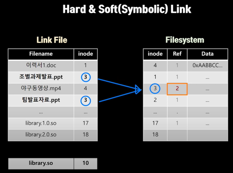 - 하드링크는 파일마다 Ref ++ 해준다. 0 이되야 삭제된다. 파일만 하드링크가 가능하다. ( > ln src dest )