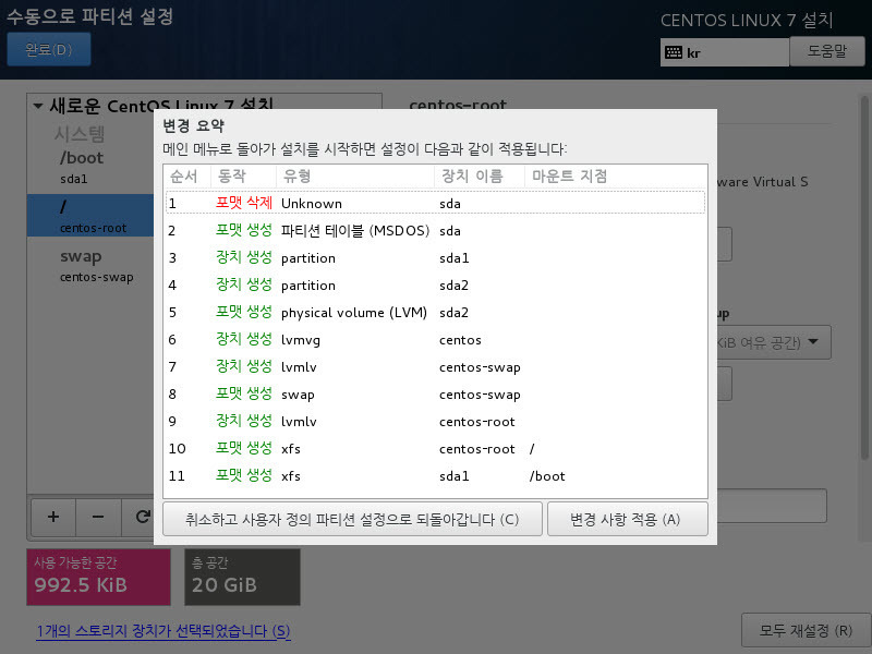 그러므로 swap 공간을 2G로 설정하고 그 외 /boot 500M 와 나머지 용량은 /(root)로 지정하였다.