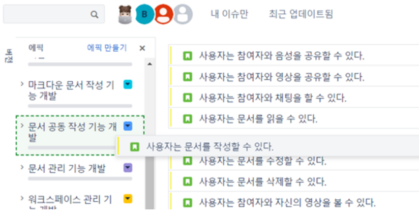 스토리 혹은 작업을 드래그하여 에픽 또는 원하는 스프린트에 할당할 수 있다.