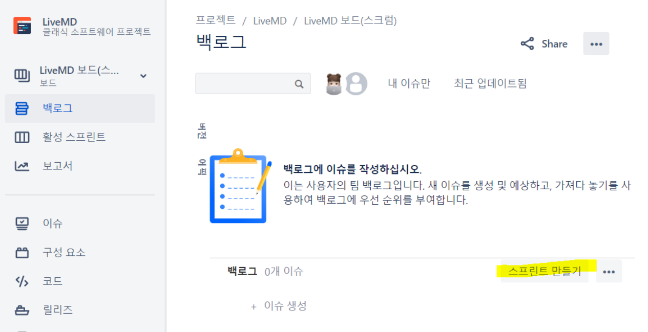 백로그 작성을 위해 이슈 생성 버튼 클릭
