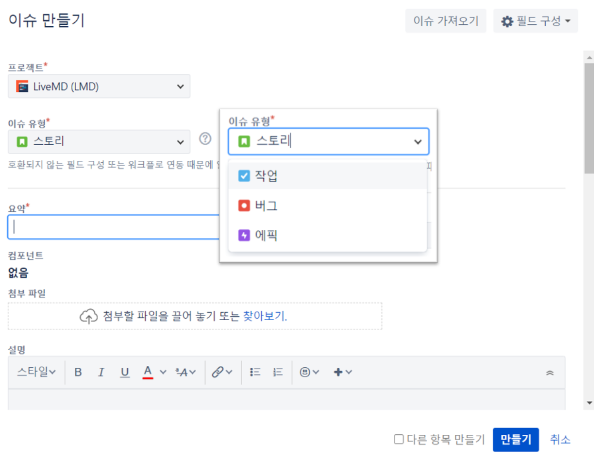 이슈(조그맣게 나눈 할일)의 번호는 LiveMD-1, LiveMD-2 ... 이렇게 만들어짐