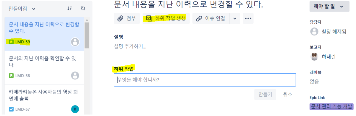 원하는 스토리를 선택하여 하위 작업을 만들 수 있다